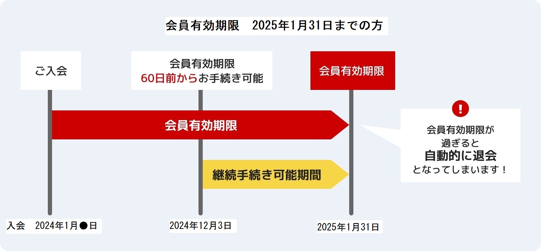 いつ手続きすれば良いの? 会員有効期限の60日前から手続きが可能です! ファンクラブサイトへログインすると継続手続きのアナウンスも表示されますので、 表示されたらうっかり忘れてしまわないように早めに手続きをしましょう!
